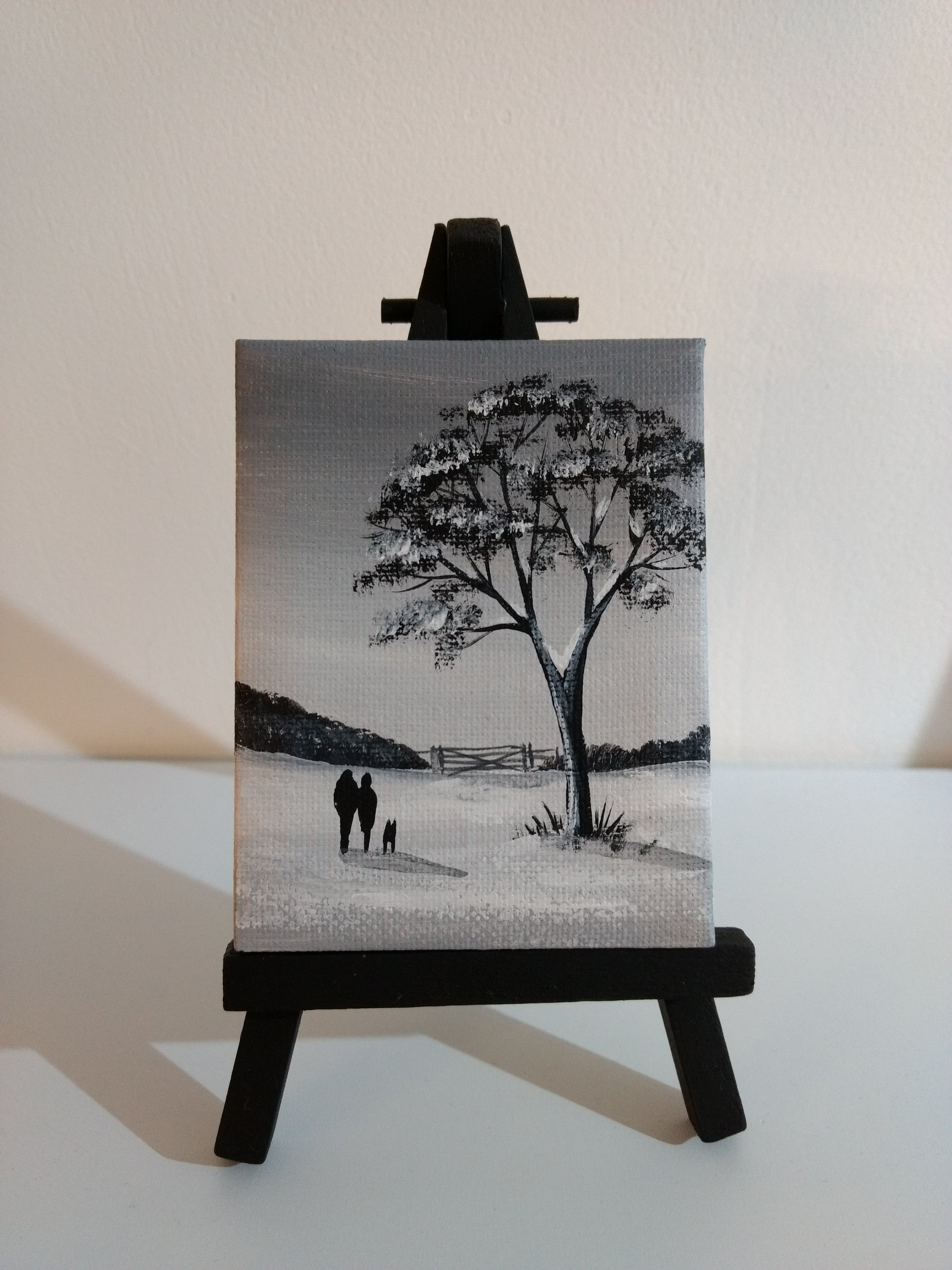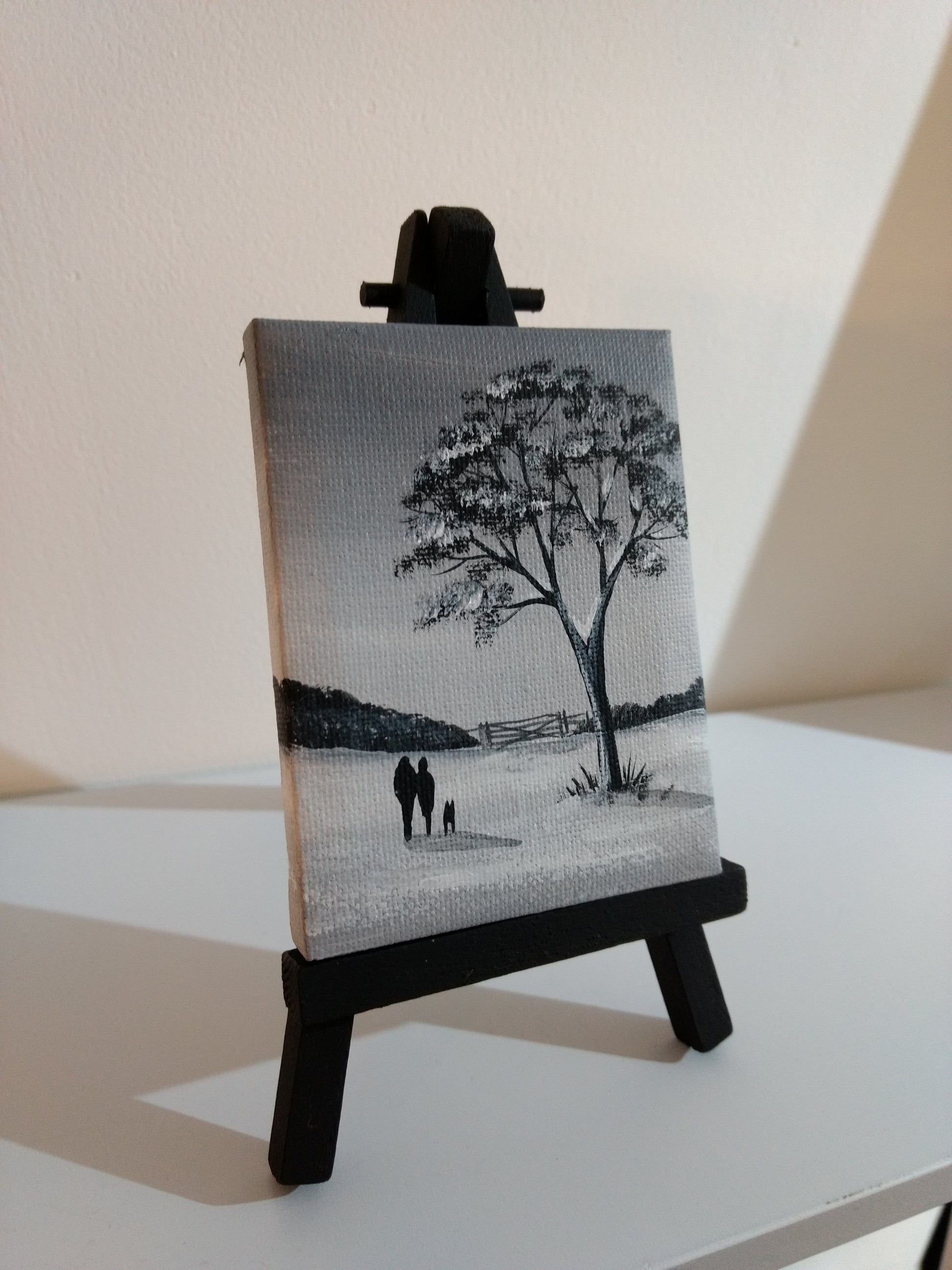 A hand painted mini canvas on easel. The canvas measures 3.5" x 2.5". Painted by Sarah Featherstone in the Wild Art Gallery.