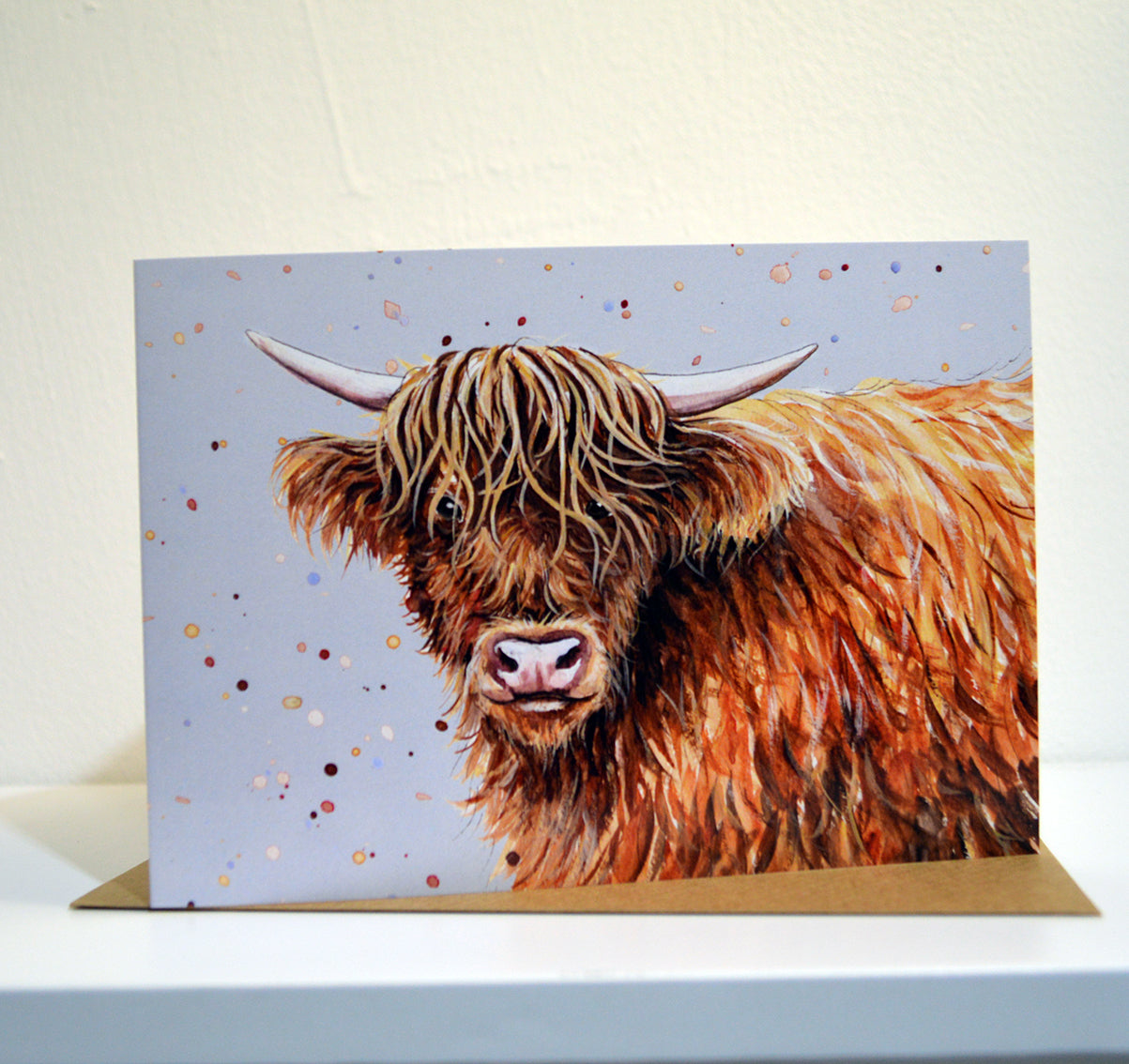 Highland Cow greeting card. This card features an original painting by Sarah Featherstone. Brown Craft envelope included, sealed in a cello bag. Size 6" x 4". Blank inside for your own message. Heavy weight card 320gsm. Professionally printed In Great Britain. Perfect card for friends and family.
