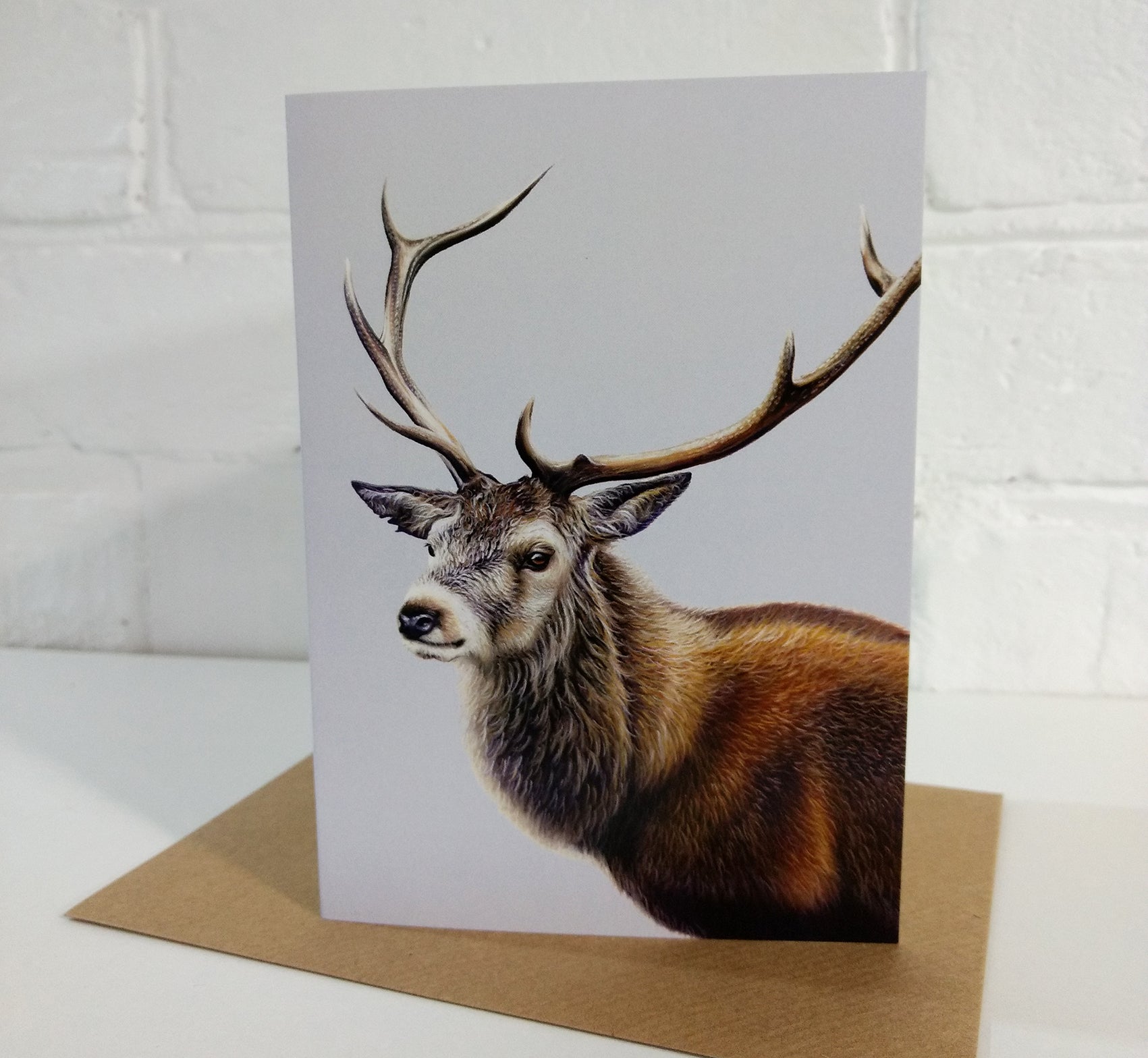 Stag greeting card.  This card features an original painting by Sarah Featherstone.  Brown Craft envelope included, sealed in a cello bag. Size 6" x 4".  Blank inside for your own message.  Heavy weight card 320gsm.  Professionally printed In Great Britain.  Perfect card for friends and family.